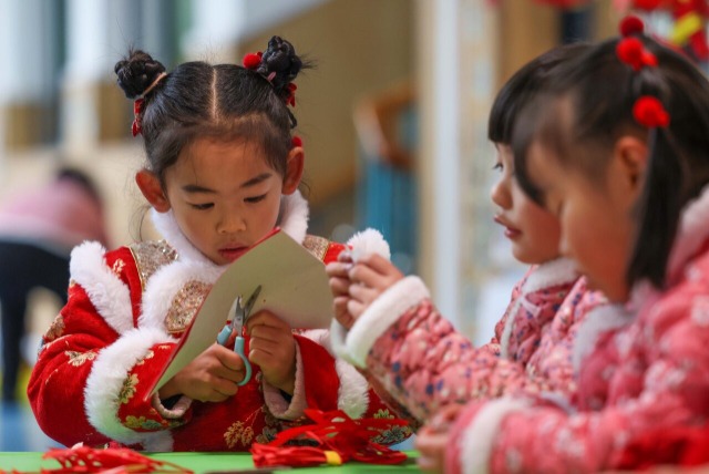 小朋友在制作迎接新春主题剪纸作品。通讯员 胡攀学 摄