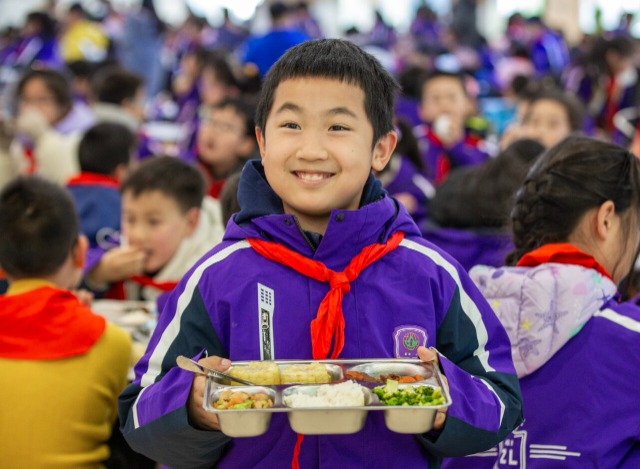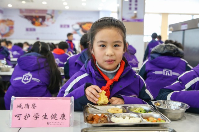 江苏省南通市紫琅第一小学关注学生体质健康,根据每年学生体测数据反馈及征求家长意见,适时推出减脂餐的个性化用餐需求。秉持少盐、少油、少糖的原则,在保证孩子总热量需求的前提下,将热量高的荤菜替换成粗粮,同时减少米饭的份量,给孩子们提供健康午餐。中国教育报-中国教育新闻网通讯员 翟慧勇 摄