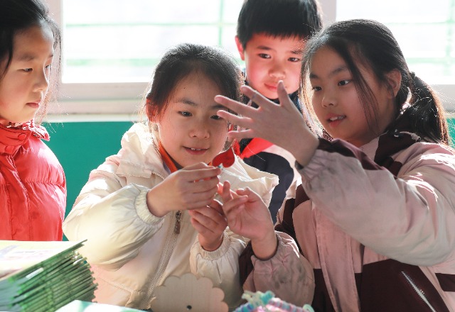 1月16日,爱心小学学生在学校劳动兴趣室内交流制作剪纸作品“中国龙”。该校剪纸社团同学们将一张张普通的纸剪成一件件非凡的艺术品。如十二生肖,创意窗花等,惟妙惟肖,活灵活现,同学们很有成就感。