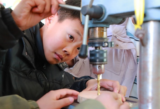 1月16日,爱心小学劳动兴趣室,“花钟设计能手”在自制数学教具。