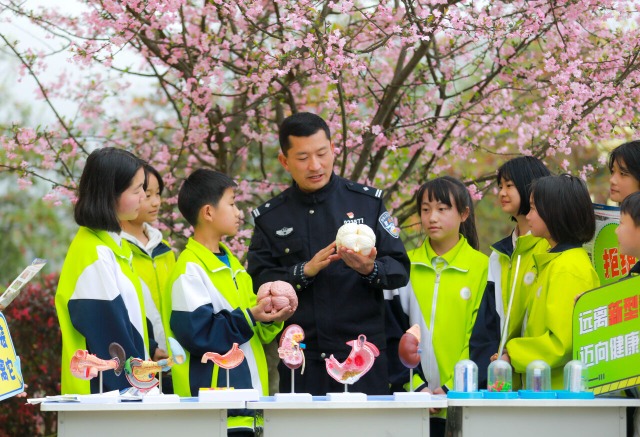 3月26日,贵州省黔西市公安局大关派出所来到辖区桂箐中学开展“禁毒知识进校园”活动,通过发放禁毒资料和模型展示让学生生动形象地了解毒品的种类、特征、危害及防范毒品技巧等知识,提高学生识毒、防毒、拒毒的能力和意识。中国教育报-中国教育新闻网通讯员 周训超 摄