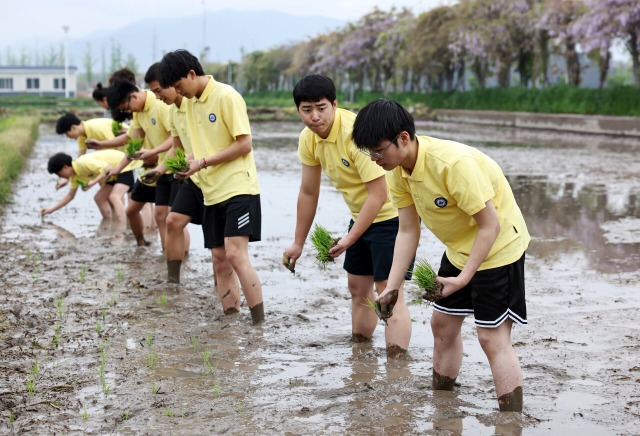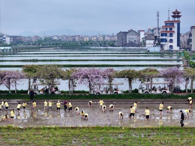 4月7日,浙江广厦建设职业技术大学管理工程学院的大学生走进浙江省东阳市城东街道寀卢村共享田园,组织开展“我为插秧下次田”农耕文化体验实践活动,以劳动特色教育探索职业教育、思政教育融合新途径。中国教育报-中国教育新闻网通讯员 胡扬辉 陈敏俊 摄