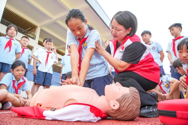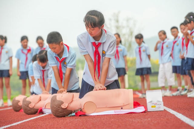 2024年9月12日,浙江省湖州市德清县阜溪街道红十字会联合德清县阜溪学校开展“急救知识进校园”活动,红十字志愿者现场教小学生心肺复苏、包扎等应急救护知识,提高小学生紧急避险意识和应急救护能力,迎接“世界急救日”的到来。(中国教育报-中国教育新闻网通讯员 王树成 摄)