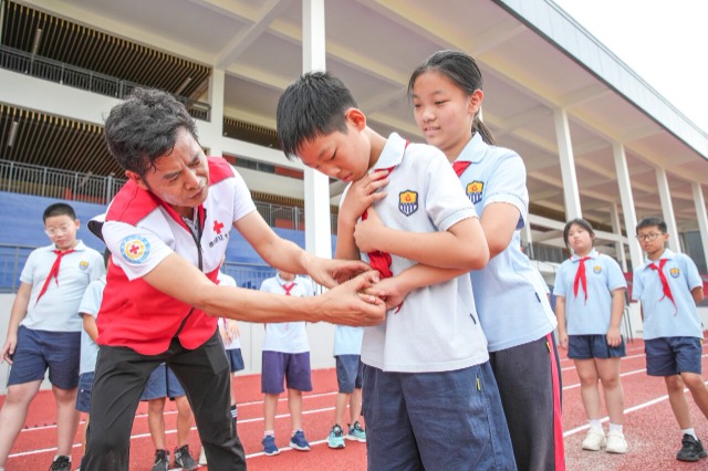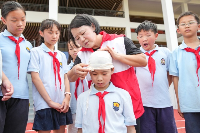 红十字志愿者向学生传授包扎急救技能 王树成 摄