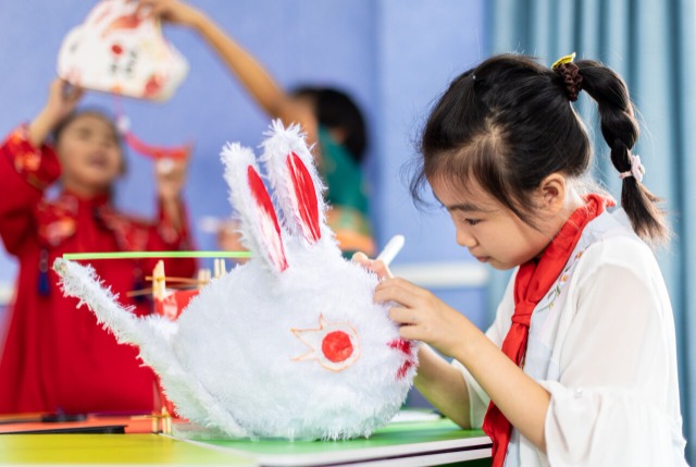2024年9月12日,内蒙古呼和浩特市玉泉区恒昌店巷小学开展“月满中秋同欢乐”活动,孩子们通过学习制作月饼、猜灯谜、绘制玉兔花灯、书写中秋诗词佳句等方式,感受中国传统文化的独特魅力,喜迎中秋佳节。(中国教育报-中国教育新闻网通讯员 丁根厚 摄)