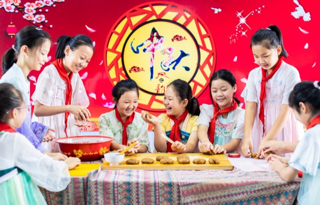 学生在学习制作手工月饼 丁根厚 摄