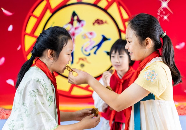 学生在品尝自制的手工月饼 丁根厚 摄