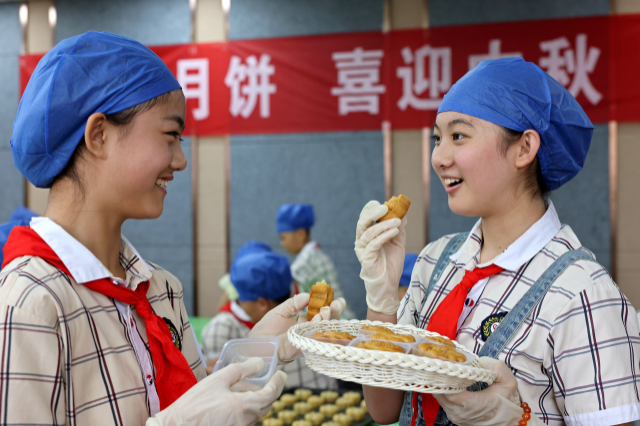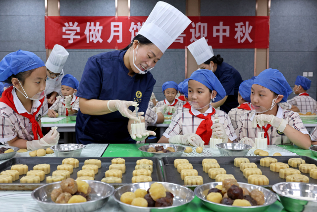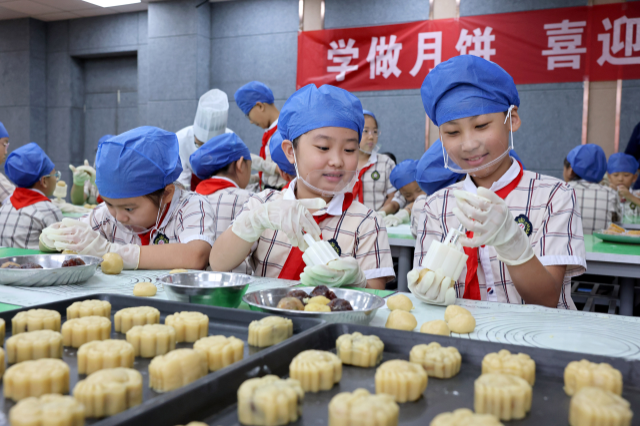 9月13日,为迎接中秋佳节,山东省枣庄市文化路小学开展“学做月饼 喜迎中秋”活动,学生们在糕点师的指导下学习制作手工月饼,在提高动手能力的同时,感受传统文化的魅力。(中国教育报-中国教育新闻网通讯员 吉喆 摄)