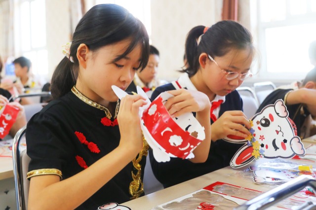 9月12日,河北省张家口市桥东区花园街街道建设东街社区联合驻街单位博师口腔门诊、宝善街小学开展学民俗、迎中秋活动,学生们学习民俗知识、制作赏月花灯、切团圆饼,了解中秋文化的同时感受中华民族传统节日的浓厚氛围。(中国教育报-中国教育新闻网通讯员 岑屹 摄)