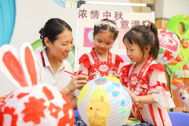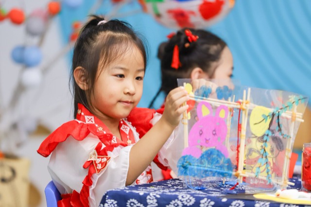 2024年9月14日,山东省青岛市李沧区夏庄路幼儿园开展“巧做花灯 喜迎中秋”传统文化主题活动,老师向小朋友们介绍中秋佳节的民俗文化,指导小朋友利用各式材料创意制作花灯,感受中华民族传统文化魅力,喜迎中秋佳节到来。(中国教育报-中国教育新闻网通讯员 张鹰 摄)