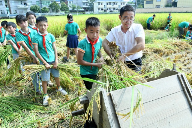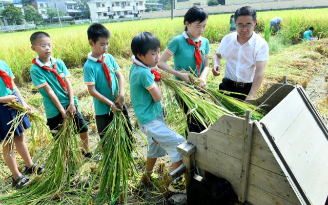 学生在老师的指导下,体验传统打谷机收割稻谷乐趣。卓忠伟 周卫英 摄