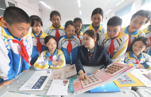 工作人员为学生们介绍集邮知识 贾敏杰 摄