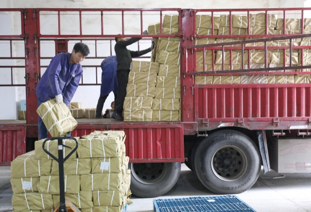 工人在搬运教材。通讯员 何红福 徐斌 摄