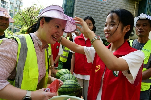 当日,江苏省镇江市润州区宝塔路街道黄山社区联合江苏大学志愿者开展“为环卫工送清凉”活动,向辖区的环卫工人赠送风扇帽、西瓜、风油精等防暑用品,为“城市美容师”们送上夏日关怀。 (中国教育报-中国教育新闻网 通讯员 石玉成 摄)