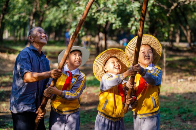 秋分时节,山东省淄博市高青县实验小学的学生走进古枣园开展劳动实践活动。中国教育报-中国教育新闻网通讯员 张维堂 摄