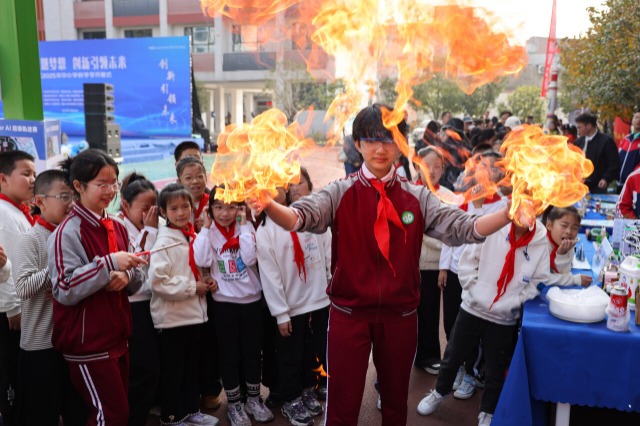 学生们正在进行“火焰拳”的科学实验展示。通讯员 付晓方 摄