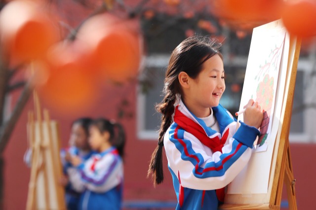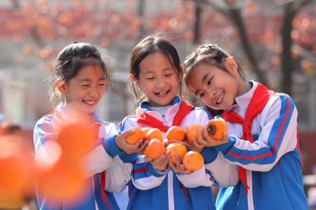 深秋时节,山东省高密市恒涛实验小学的柿子林里就挂满了红彤彤的柿子,犹如一盏盏小灯笼,为校园增添了一抹亮丽的色彩。每到大课间或课后延时服务时间,孩子们在柿子林里摘柿子、画画、嬉戏、读书,与大自然亲密接触,乐享金秋好时光。(中国教育报-中国教育新闻网 通讯员 李海涛 摄)
