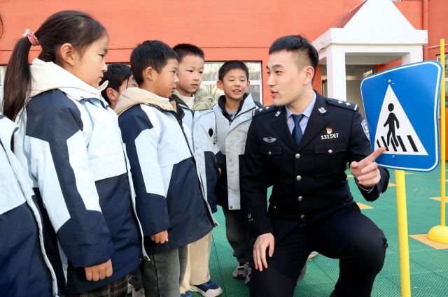 11月26日,江苏省宿迁市公安局宿城分局府苑派出所民警向小朋友宣传交通安全知识。民警以通俗易懂的语言讲解交通安全知识,用游戏、问答等互动方式引导小朋友要遵守交通规则,增强交通安全意识,养成良好的文明交通安全习惯。中国教育报-中国教育新闻网通讯员 王力 摄