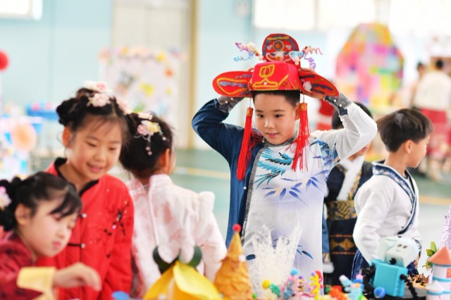 近日,山东省青岛市市北区福州路小学开展丰富多彩的传统文化成果展示活动。孩子们在老师的指导下,通过学习泥塑、绒花、扎染、竹编等内容制作,体验非遗之美,传承中华优秀传统文化。中国教育报-中国教育新闻网通讯员 王海滨 摄