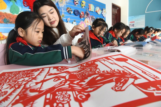 老师在指导学生创作马年剪纸作品。通讯员 程学虎 摄