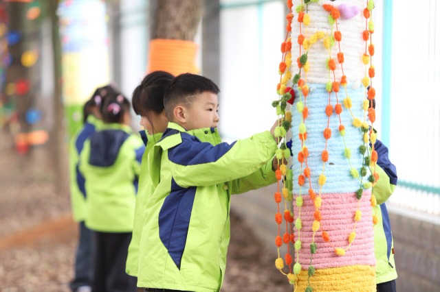 12月23日,江西省上饶市余干县实验幼儿园开展“我为大树穿新衣”主题活动,孩子们化身“爱心小工匠”,用彩色棉线、旧织物编织温暖,为校园的大树“穿上”了五彩斑斓的“毛衣”,让树木看起来生机勃勃,为冬日的校园增添了几分俏皮与活力。中国教育报-中国教育新闻网通讯员 韩海建 摄