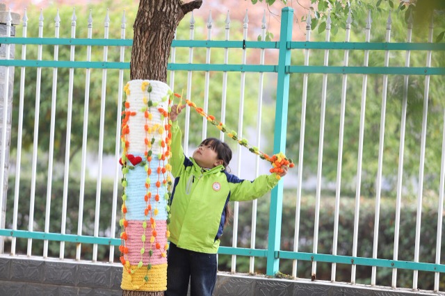 小朋友们为大树“穿毛衣”,给校园添温暖。通讯员 韩海建 摄