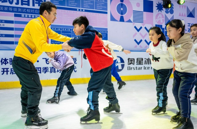 学生在专业教练指导下学习滑冰基本功。通讯员 丁根厚 摄