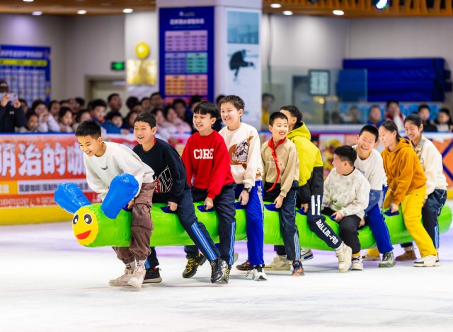 学生在玩冰上毛毛虫趣味游戏。通讯员 丁根厚 摄