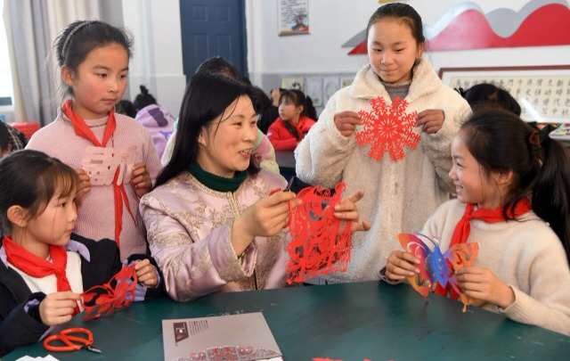 安徽省六安市裕安区西河口乡中心小学自2013年起开设剪纸课堂,剪纸非遗传承人、教师汪发云为学生传授剪纸技艺,培养孩子们的动手实践能力,让山区娃娃体验传统非遗文化的魅力,感受指尖上的乐趣。(中国教育报-中国教育新闻网 通讯员 陈力 摄)