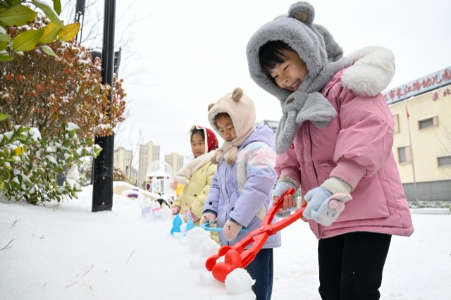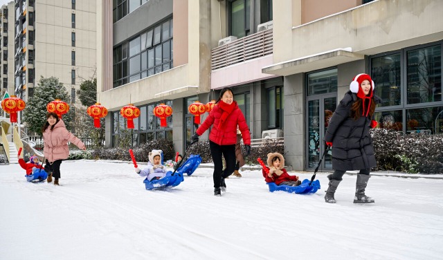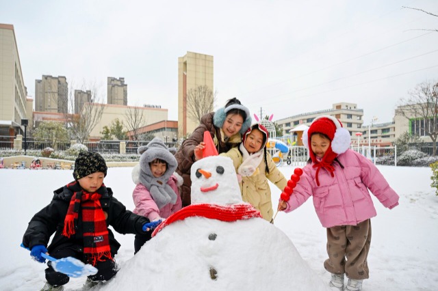 1月20日,安徽省合肥市普降大雪,长江路幼儿园淮北路分园的孩子们在老师的带领下来到户外玩耍,堆雪人、打雪仗、滑雪车,尽情享受雪中乐趣。中国教育报-中国教育新闻网通讯员 赵明 摄