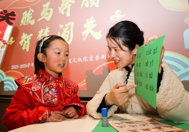 1月22日,湖北省十堰市东方远志学校结合低年级学生学习认知规律和心理需求,以趣味闯关替代传统测试,孩子们在欢乐闯关里夯实知识、大胆表达、展示学习成果。中国教育报-中国教育新闻网通讯员 迟力伟 摄
