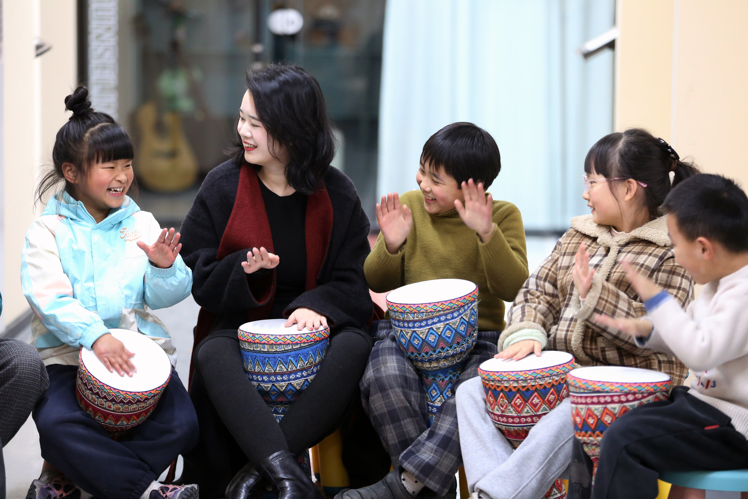 在四川省乐山市市中区海棠街道桂花楼社区“寒假公益托管班”,老师和小朋友一起练习非洲鼓。通讯员 李华时 摄