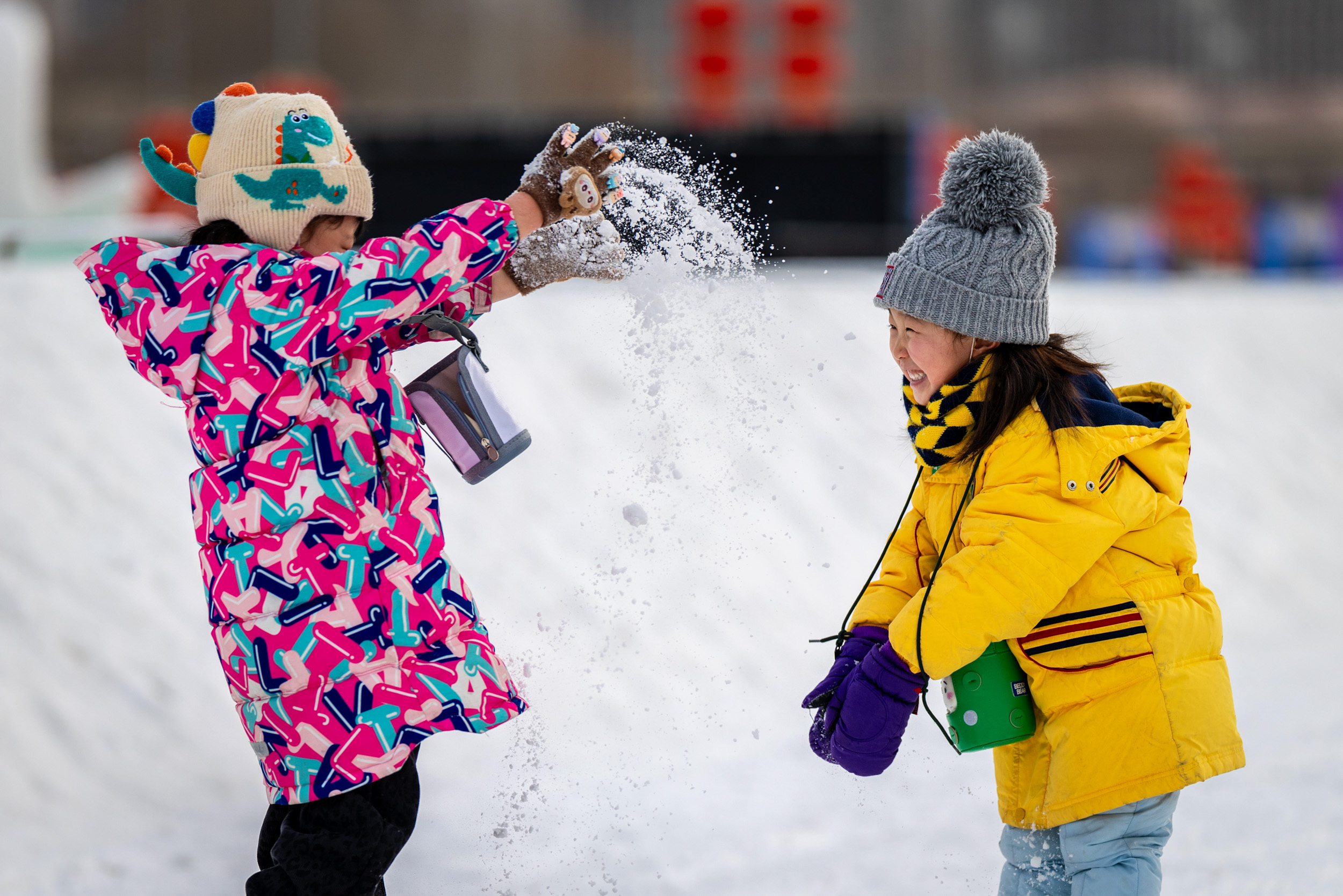 1月30日,孩子们在内蒙古呼和浩特市东河冰雪场戏雪游玩。丁根厚 摄