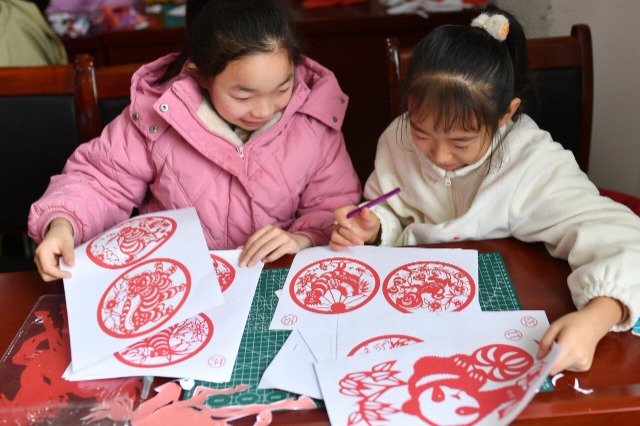 2026年2月10日,在山东省青岛市城阳区红岛街道嘉苑社区党群服务中心,孩子们通过剪窗花迎新春等内容,体验手工乐趣,在学习传统文化过程中充实假期生活。(中国教育报-中国教育新闻网 通讯员 王海滨 摄)