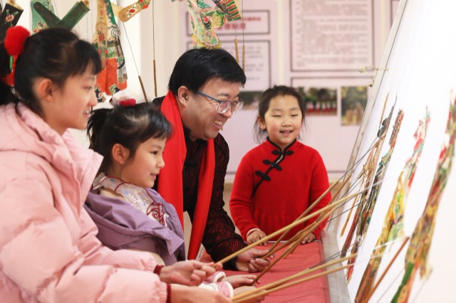 皮影传承人指导小朋友表演皮影戏 朱大勇 摄