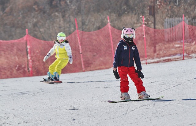 小游客在河北省秦皇岛市海港区石门寨镇的天女小镇滑雪场体验滑雪 曹建雄 摄