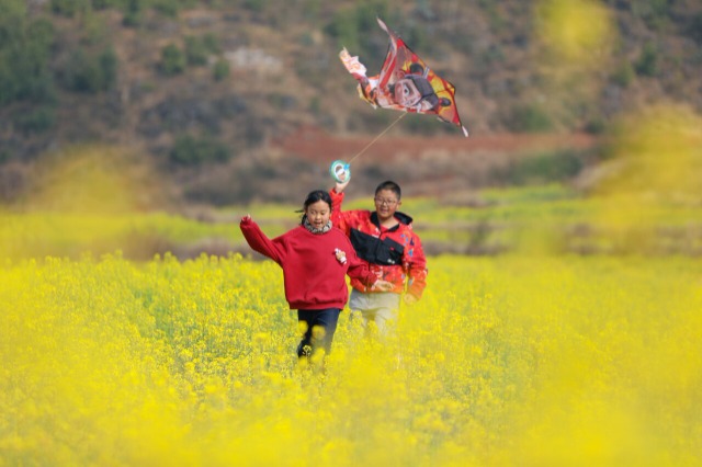 2月19日,云南省曲靖市陆良县芳华镇复兴村满目金黄、春意盎然,孩子们在烂漫的油菜花田间追逐嬉戏,在暖阳与花香中欢度美好假日。中国教育报-中国教育新闻网通讯员 王勇 摄