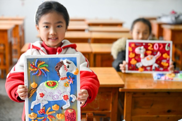 学生在展示假期完成的手工艺品。通讯员 袁福洪 摄