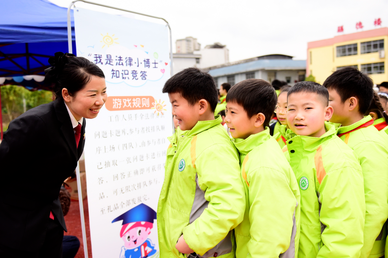 县人民法院法官在贵州省黔东南苗族侗族自治州从江县城关第一小学组织学生参加“我是法律小博士”知识竞答游戏。
