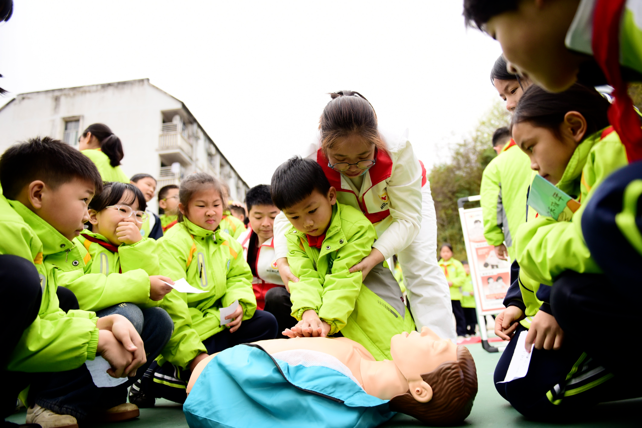 工作人员在贵州省黔东南苗族侗族自治州从江县城关第一小学指导学生开展心肺复苏实操讲解。
