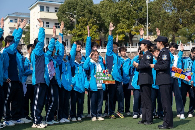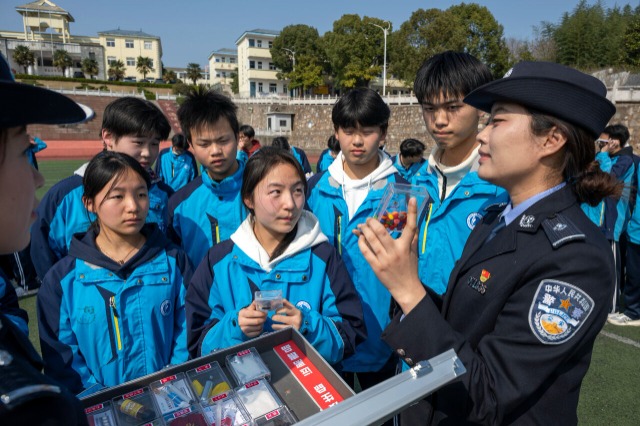 3月12日,安徽省芜湖市公安局繁昌分局孙村镇派出所民警走进恒杰双语学校,开展“禁毒+反欺凌+反诈”综合普法宣讲。民警通过仿真毒品模型展示、真实案例剖析及互动问答等形式,向学生讲解新型毒品伪装特征、校园欺凌的法律后果及防范电诈技巧,引导学生树立自我保护意识。中国教育报-中国教育新闻网通讯员 肖本祥 摄