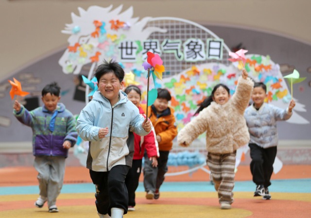 孩子们手持小风车开展气象知识闯关游戏 赵平 李玲飞 摄
