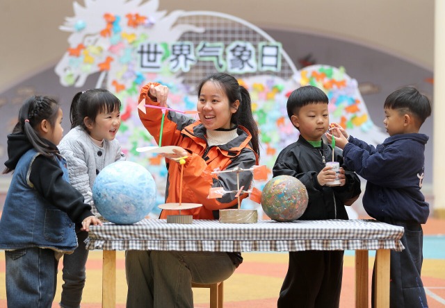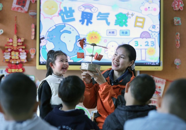 2026年3月23日是第66个世界气象日,今年的主题为“测今日气象,护明日家园”。当日,湖北省荆门市东宝区长宁实验幼儿园的老师们,巧用雨天的天然场景,带着孩子们观测雨量、制作气象小模型、玩气象知识闯关游戏,让孩子们在亲身体验中探索气象奥秘。连日来,荆门市持续开展“气象科普进校园”活动,将气象观测、防灾减灾等实用知识送进课堂,用互动体验激发孩子们的科学探索热情。(中国教育报-中国教育新闻网 通讯员 赵平 李玲飞 摄)
