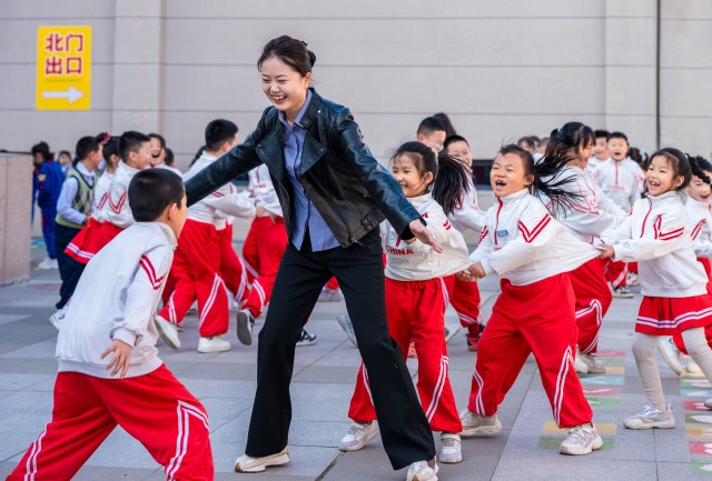 3月25日,内蒙古呼和浩特市南马路小学新华西街校区的师生在“15分钟课间”玩老鹰捉小鸡游戏。丁根厚 摄