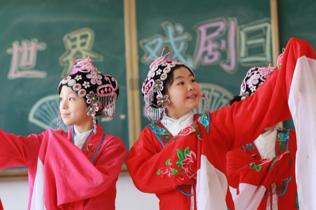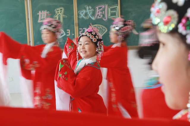 世界戏剧日来临之际,山东省高密市崇实小学开展“茂腔文化进校园”活动。在学校舞蹈教室,孩子们在戏曲老师的指导下学习、练习茂腔的唱念和身段等基础知识,感受当地传统戏剧的魅力。茂腔是山东省高密市的地方传统戏剧,国家级非物质文化遗产之一。近年来,该校通过开设茂腔社团课、校园小剧场展演、茂腔名家进校园等形式推动戏曲走进校园,让戏曲融入学生学习生活,传承传统文化。(中国教育报-中国教育新闻网 通讯员 李海涛 摄)