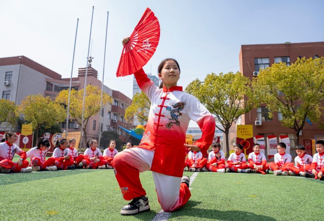 江苏省南通市通州区金沙小学紧扣“2·15专项行动计划”,将“健康第一”理念与“一校一品”建设深度融合,把传统武术引入校园,设立武术大课间普及武术特色操,通过推广太极拳和功夫扇,让孩子们增强体质的同时,传承中华优秀传统文化。(中国教育报-中国教育新闻网 通讯员 翟伟凯 摄)