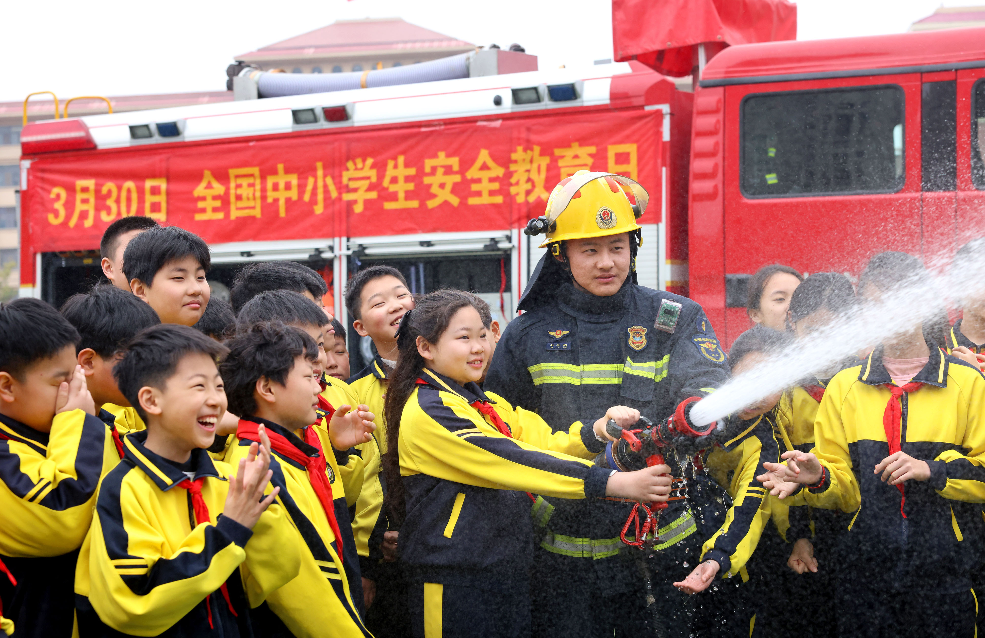 山东省枣庄市市中区东湖小学学生在消防救援人员指导下体验使用消防水枪。通讯员 孙中喆 杨列元 摄