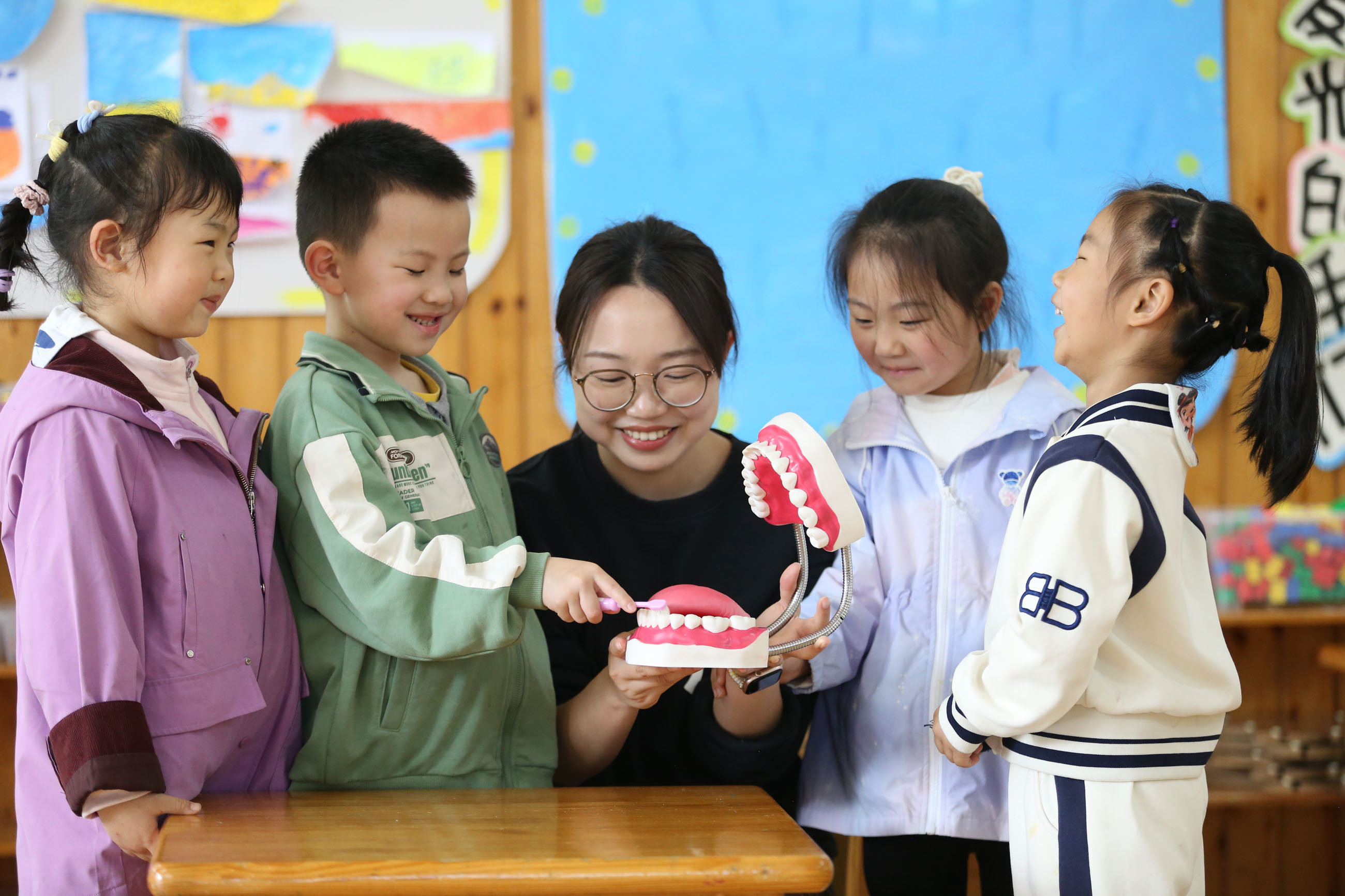 4月7日,四川省乐山市市中区翡翠实验幼儿园,保健医生为小朋友讲解牙齿保健知识和正确的刷牙方法。李华时 摄