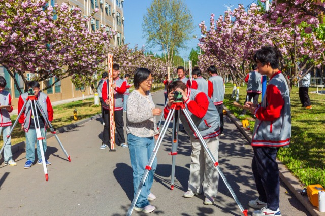 学生在校园樱花大道开展工程测量实操训练 翟慎安 摄