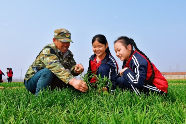 学生在聆听农民伯伯讲解小麦生长过程 孙传波 摄